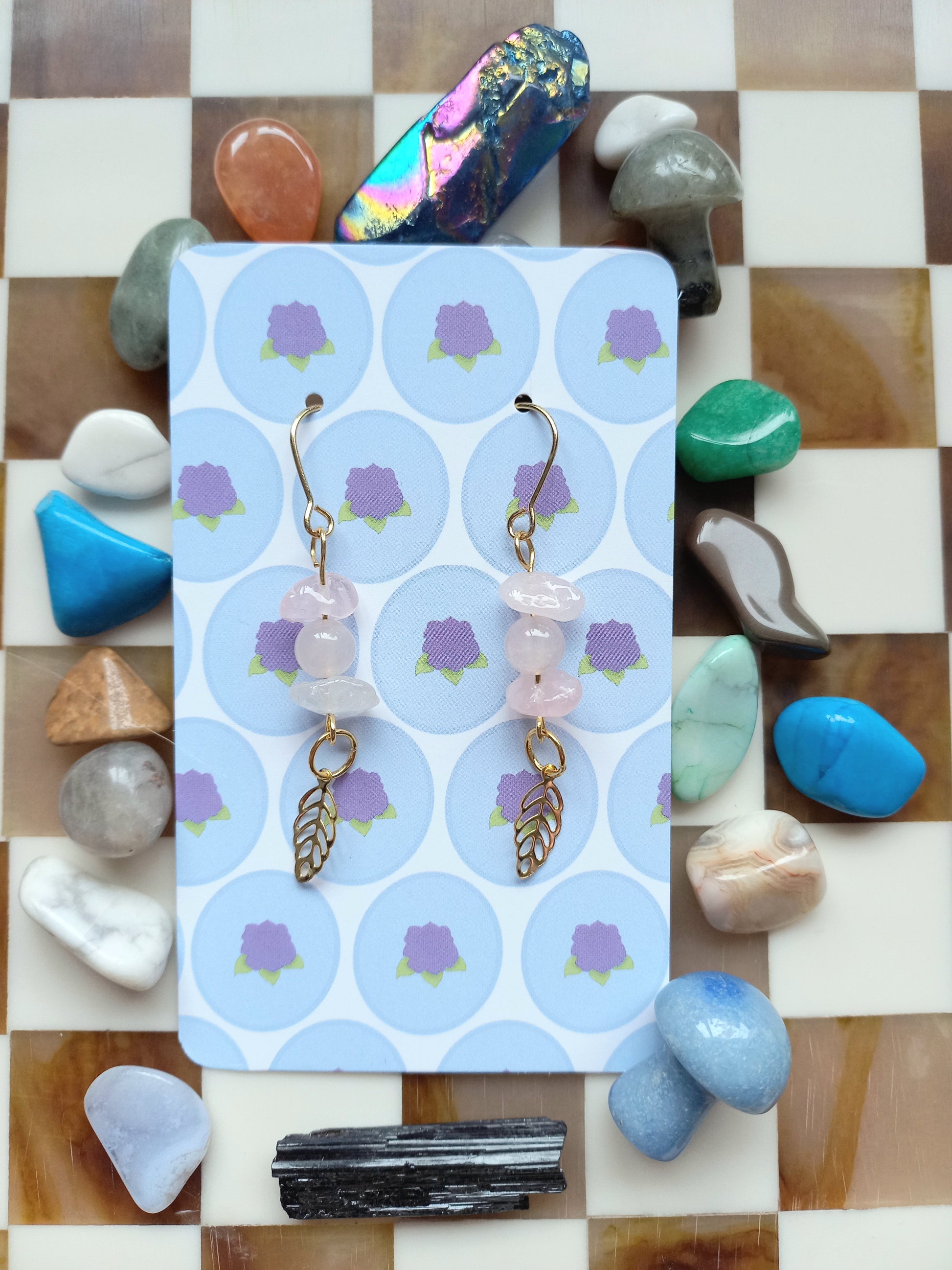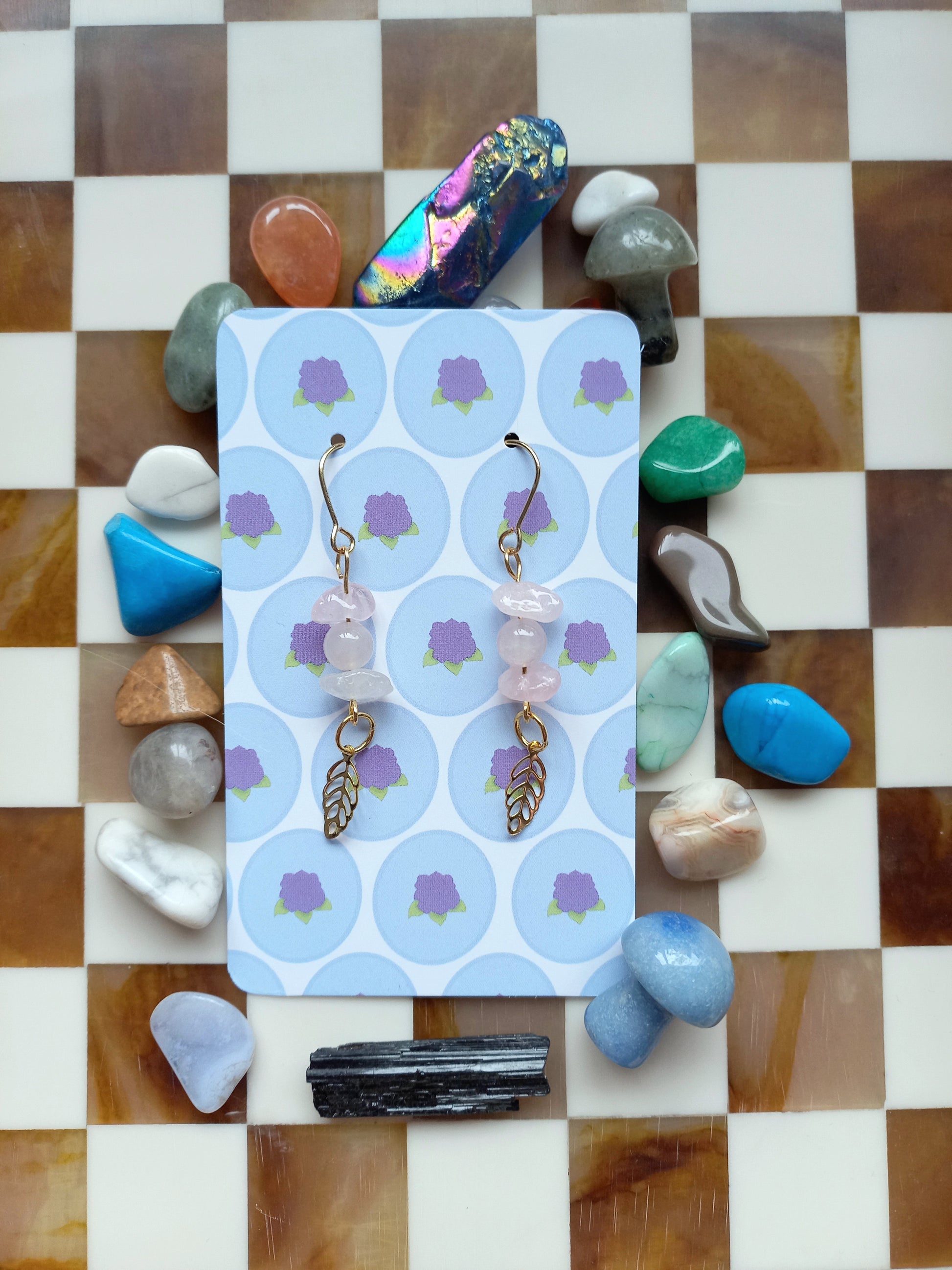 These sweet earrings feature beautiful rose quartz stones with a delicate stainless steel leaf charm at the bottom - such a perfect pairing of love and nature vibes! 🌸 They hang from stainless steel hooks and measure 5cm.
