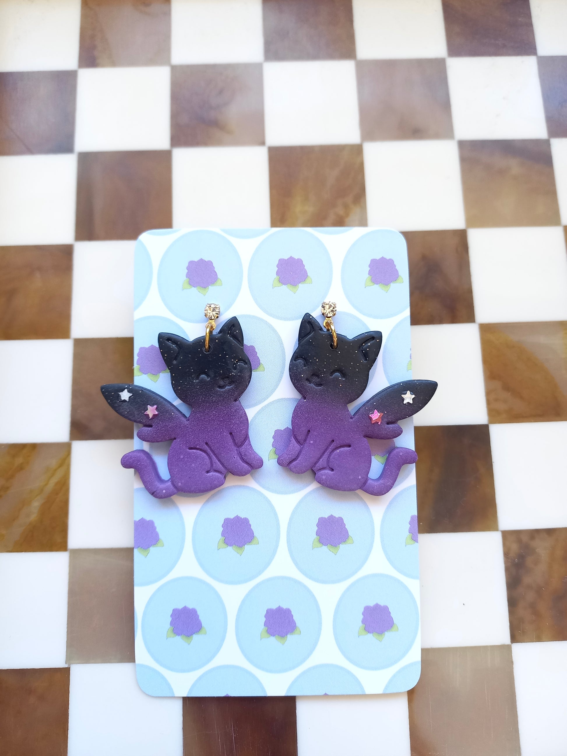 Handcrafted fairy cat earrings that bring magic to your everyday look. Featuring captivating black and purple polymer clay designs embellished with glittering stars, these beauties sit perfectly on gold stainless steel cubic zirconia studs. At just 3.5cm, they're wonderfully light and comfortable to wear all day, yet pack serious personality.